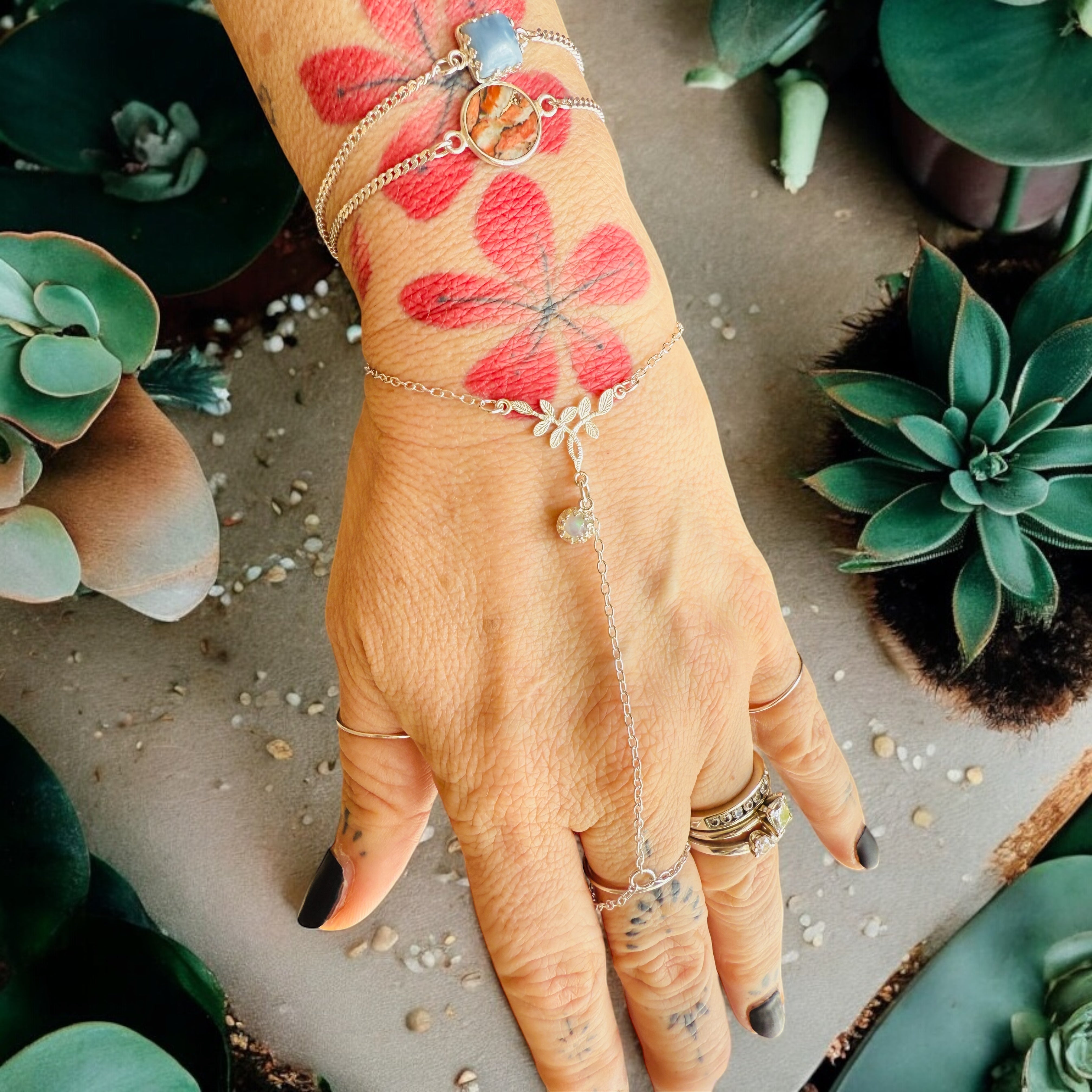 One-Of-A-Kind Gemstone Hand Chain Sterling Silver 2 Strand with Attached Chain Ring