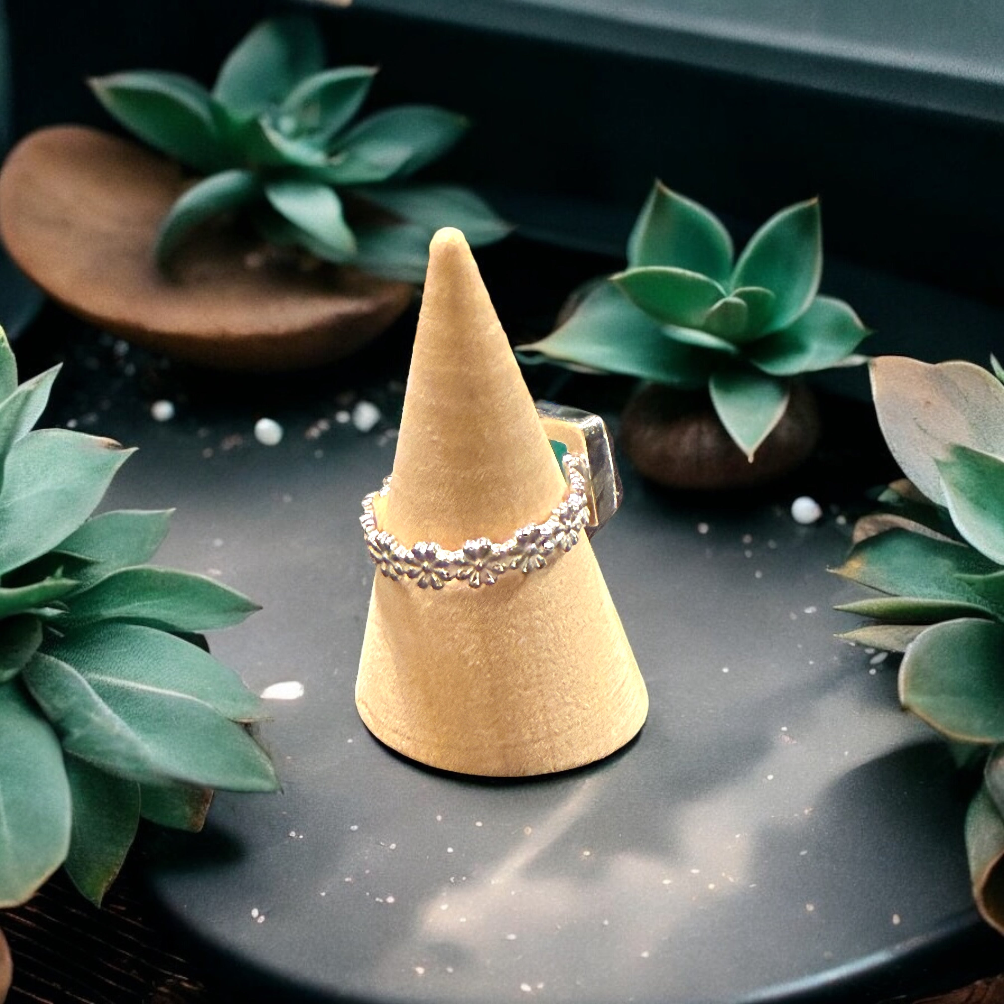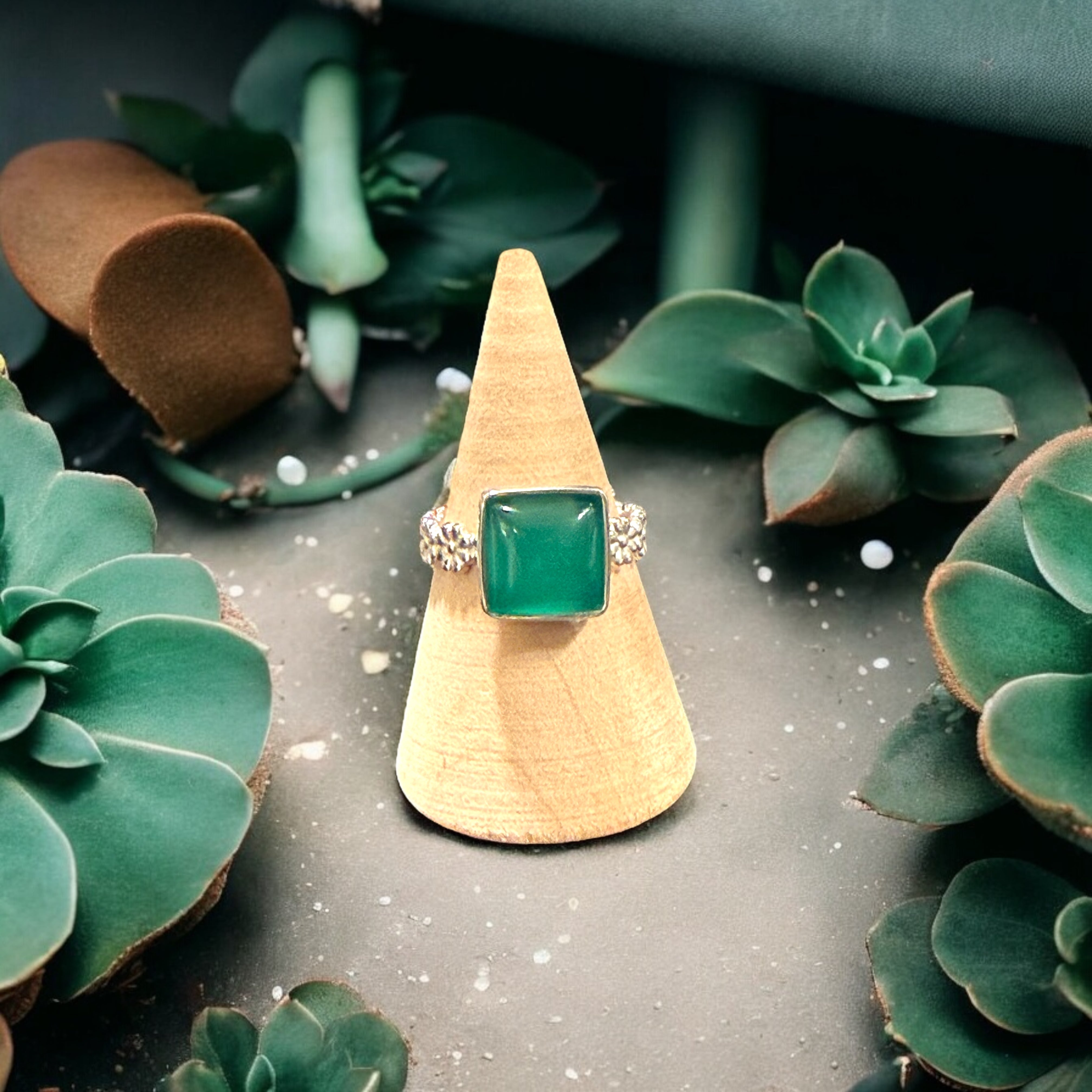 One-of-a-Kind AAA Calibrated Natural Green Onyx Sterling Silver Square Floral Band Ring