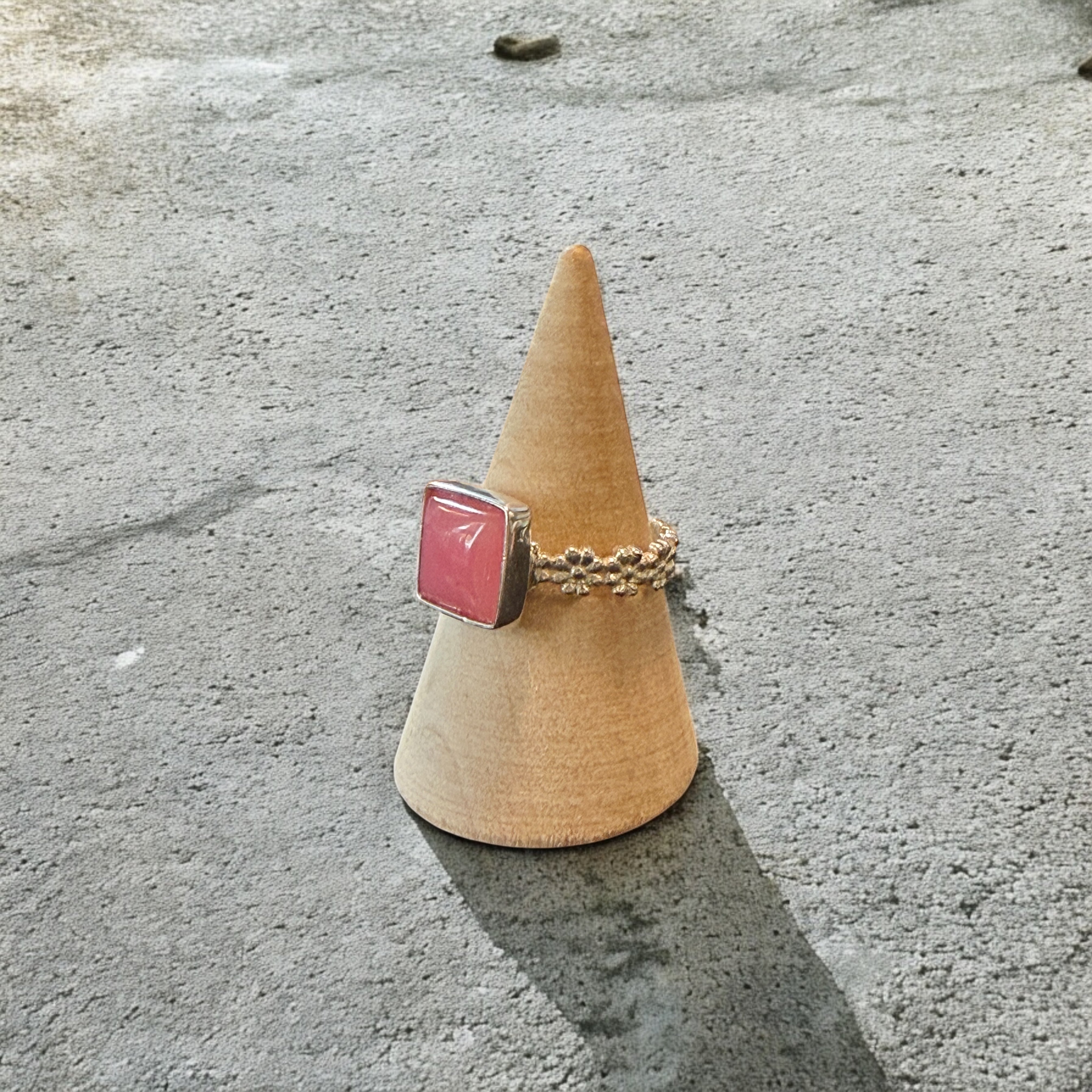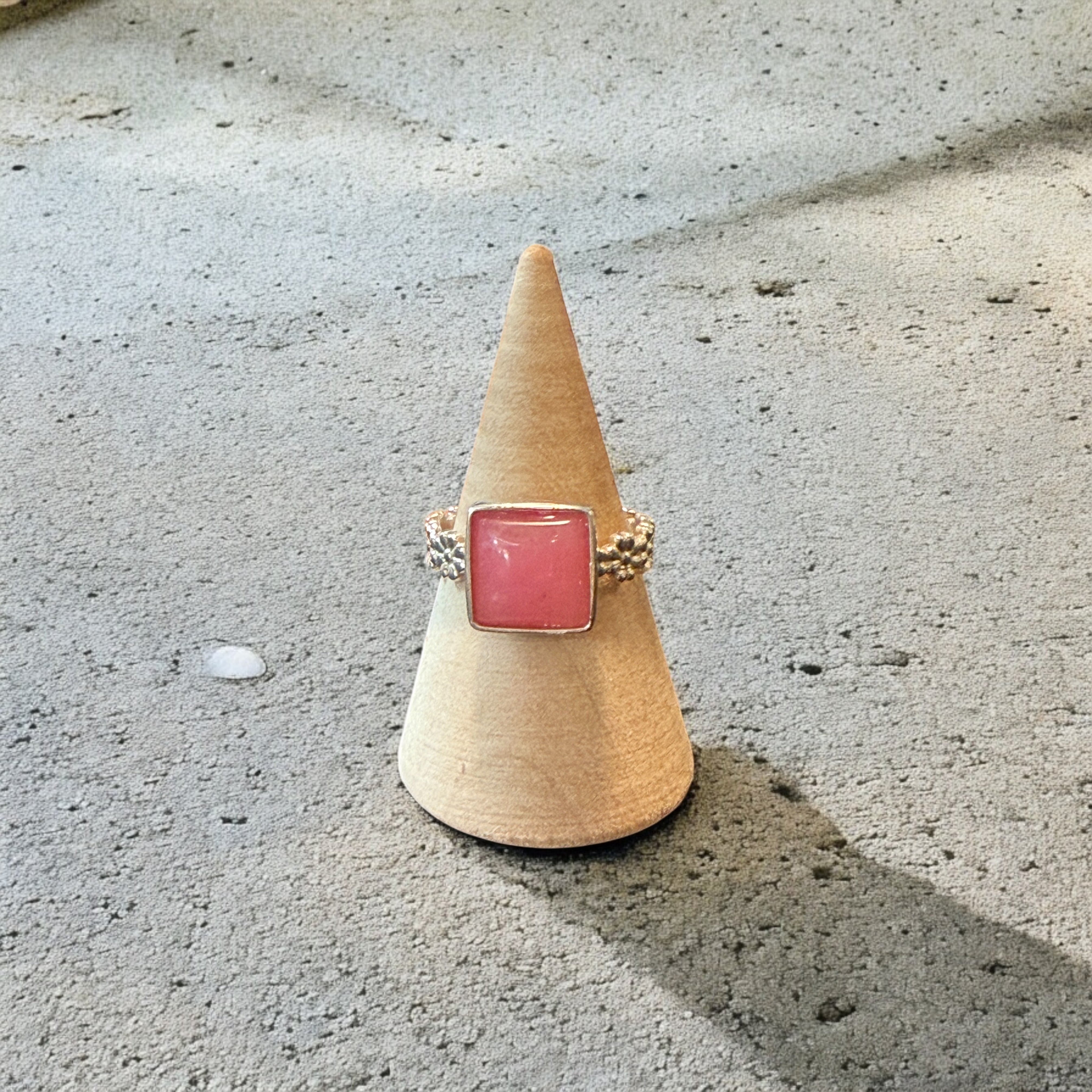 One-of-a-Kind AAA Calibrated Pink Jade Sterling Silver Square Floral Band Ring