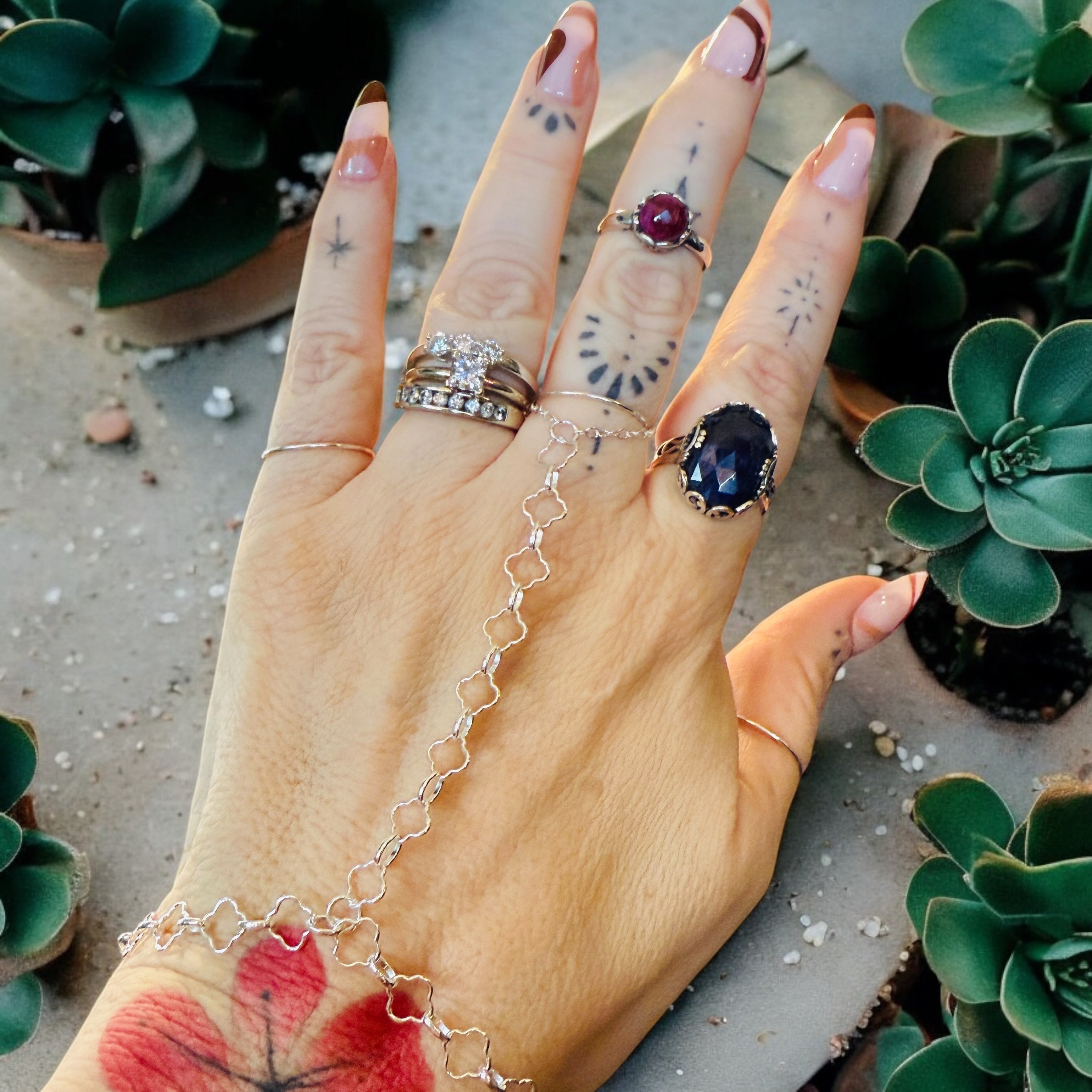 One-Of-A-Kind Gemstone Hand Chain Sterling Silver 2 Strand with Attached Chain Ring