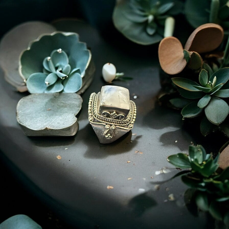 One of a Kind Rainbow Moonstone Square Sterling Silver Ring