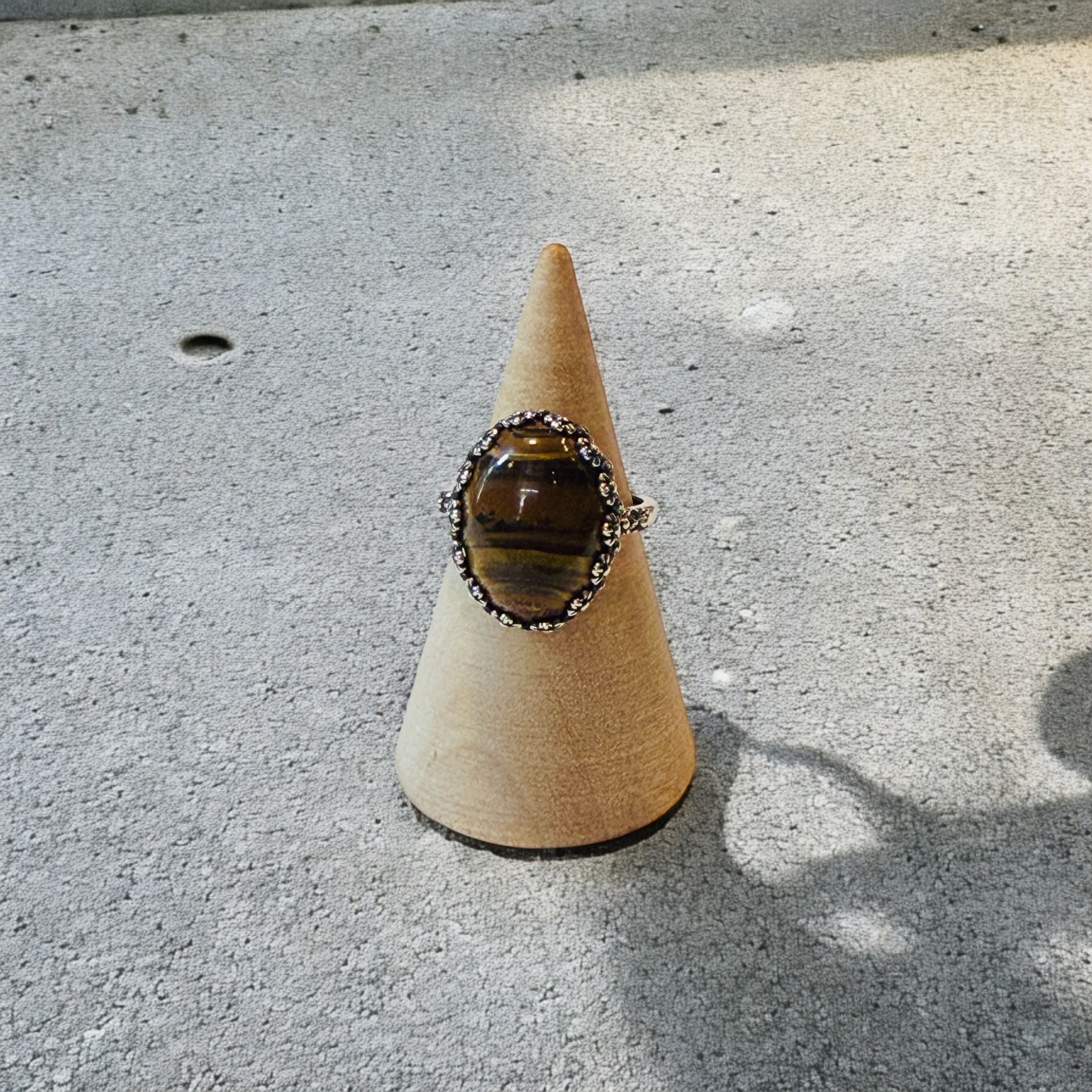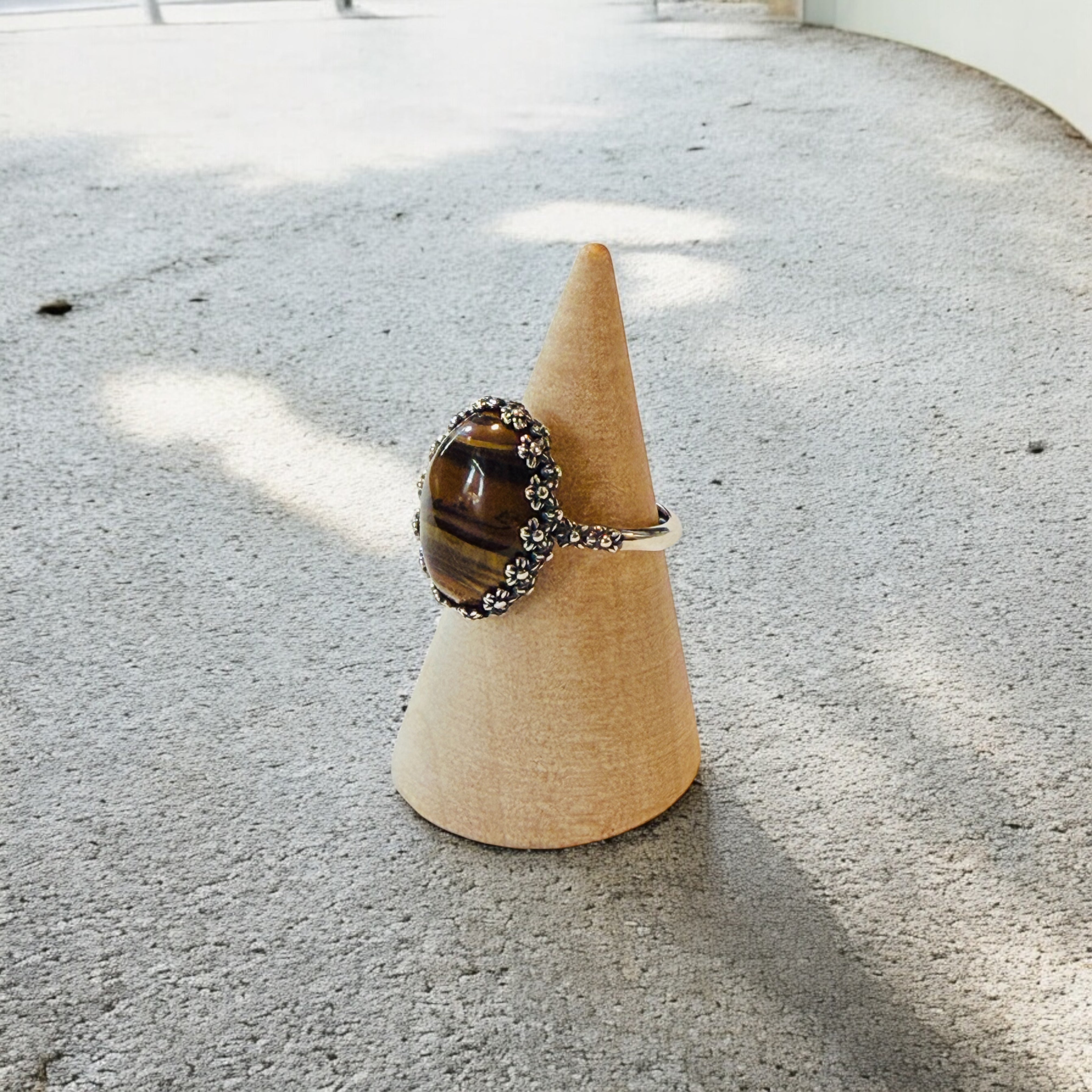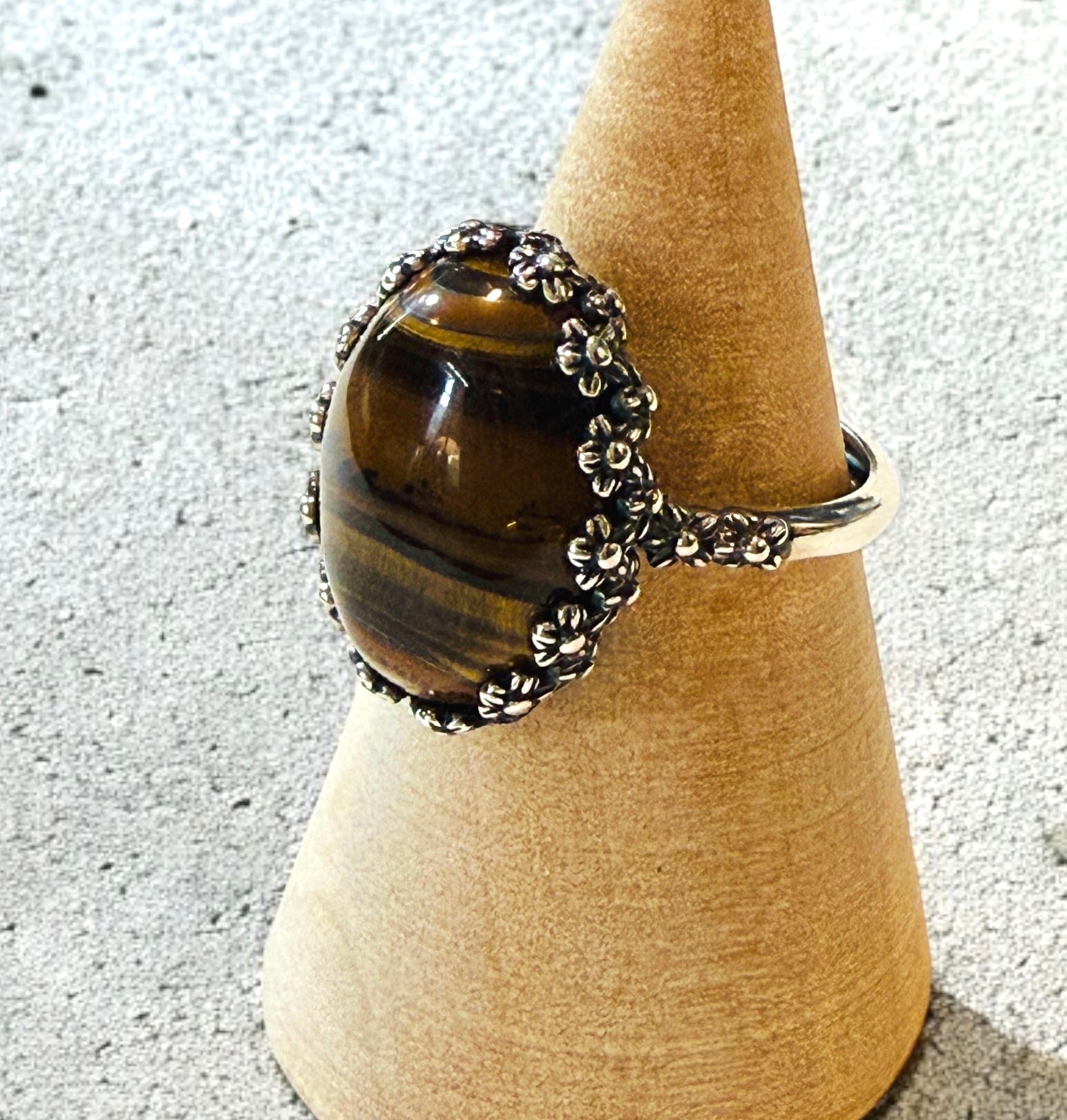 One-of-a-Kind Smooth Oval Natural Tiger Iron Floral Bezel Sterling Silver Ring